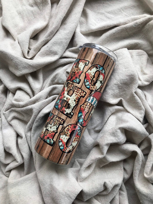 20 oz Country styled Christmas tumbler, ho ho ho stainless steel double wall tumbler, imitation wood plank and turquoise accented cup