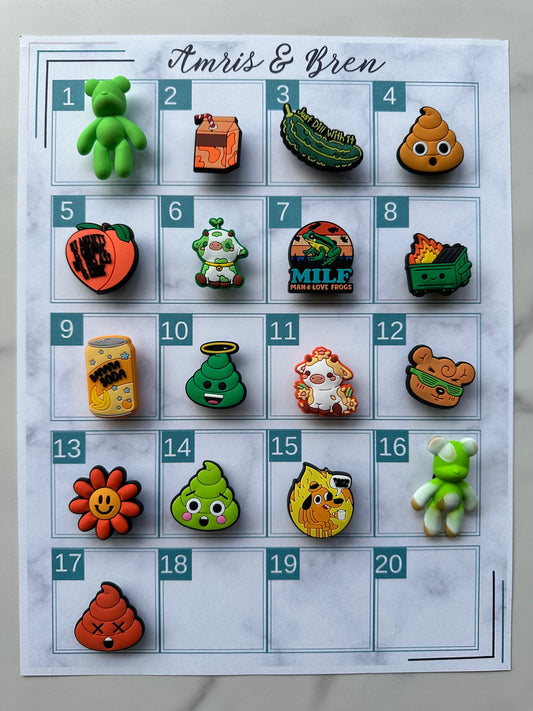 Green and orange themed shoe charms, croc compatible shoe charms, green bear shoe charms, POO charms, orange soda charm, cow charm for crocs