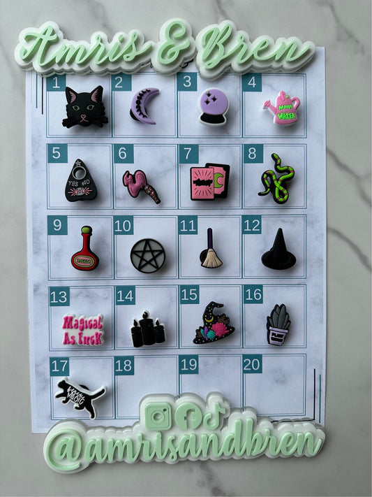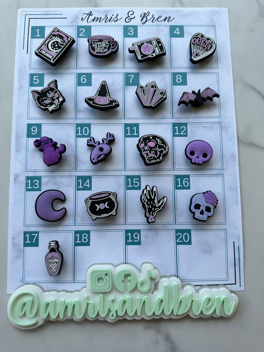 witch themed croc compatible shoe charms, trending magic clog charms, cute witch charms for crocs, moon water charms, moon charms, gems
