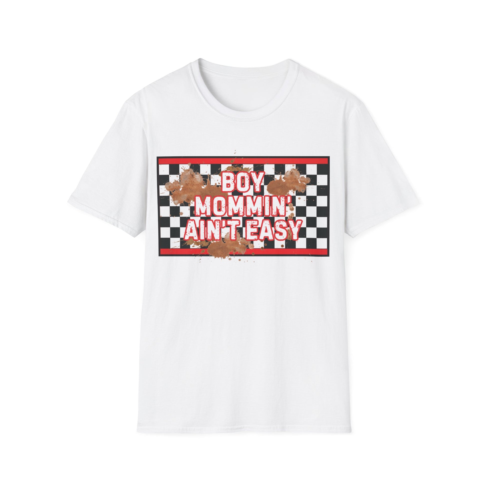 Funny shirts for boy moms with the saying 'boy mommin aint easy' printed on a unisex softstyle t-shirt. This shirt gives off a light-hearted and humorous vibe, perfect for casual everyday wear. Ideal for moms with sons who can relate to the struggles and joys of raising boys. Relevant for Mother's Day, birthdays, or just to show some mom pride.