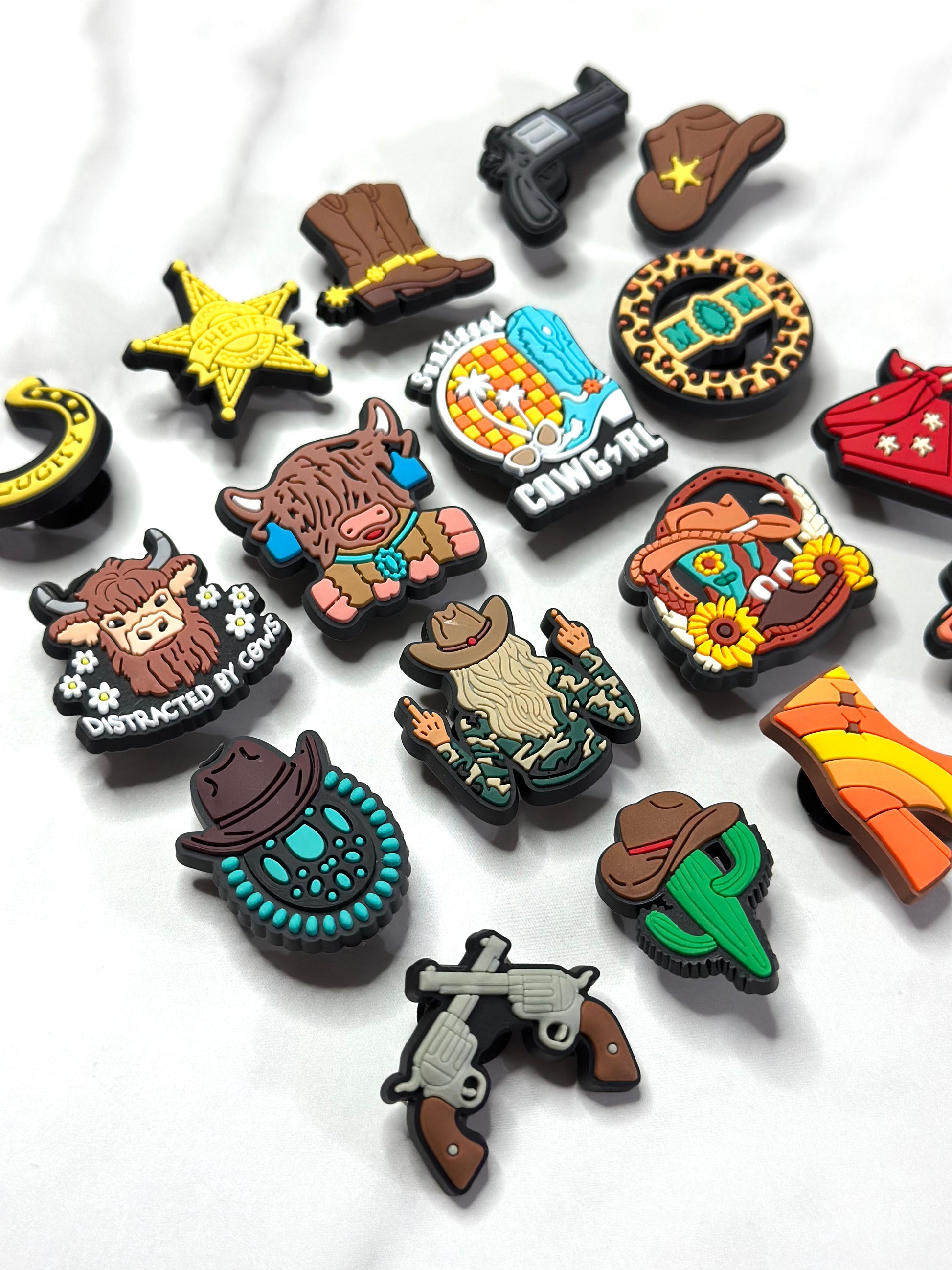 Giddy up in style with these Western-themed shoe charms—perfect for Crocs and full of personality. Whether you're channeling cowboy grit or cowgirl glam, each charm adds a bold touch to your favorite clogs. From boots and hats to steer skulls and lassos, these designs bring a little rodeo flair to your step.